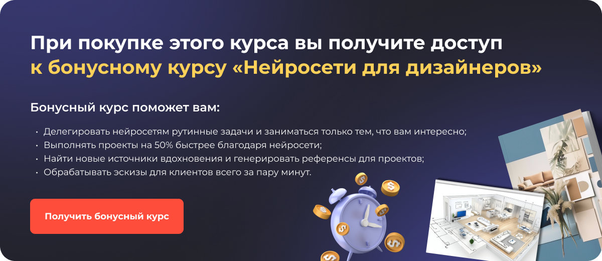 Да, программа будет полезна тем, кто хочет преобразить собственный дом или квартиру. Советуем сразу делать практические задания на примере вашего реального интерьера. Тогда к концу обучения вы получите детально проработанный дизайн-проект для себя и сможете приступить к его воплощению. За время курса вы не только составите общую концепцию, но и подберете все необходимые материалы и элементы декора, продумаете эргономику пространства.